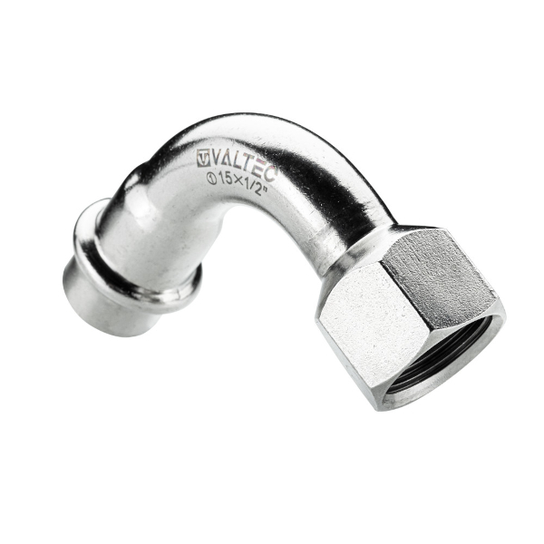 (VTi.956.I) Пресс-отвод из нержавеющей стали с внутренней резьбой обеспечивает соединение тонкостенной стальной трубы с резьбовым элементом монтируемой системы под углом 90°. Область применения – трубопроводы водоснабжения, отопления, иные инженерные и технологические установки с рабочей температурой до 120 °С и давлением до 16 бар.